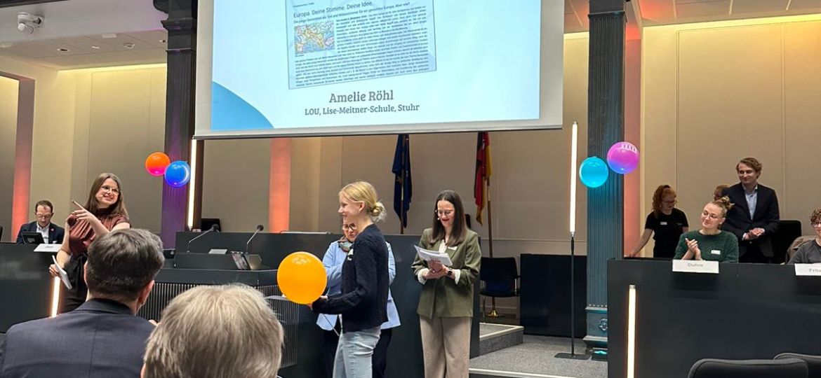Ein weiterer Höhepunkt: Amelie, die krankheitsbedingt leider fehlte, wurde mit einem Sonderpreis zum Thema Europa ausgezeichnet und darf sich über eine Reise ins Europäische Parlament in Brüssel freuen.