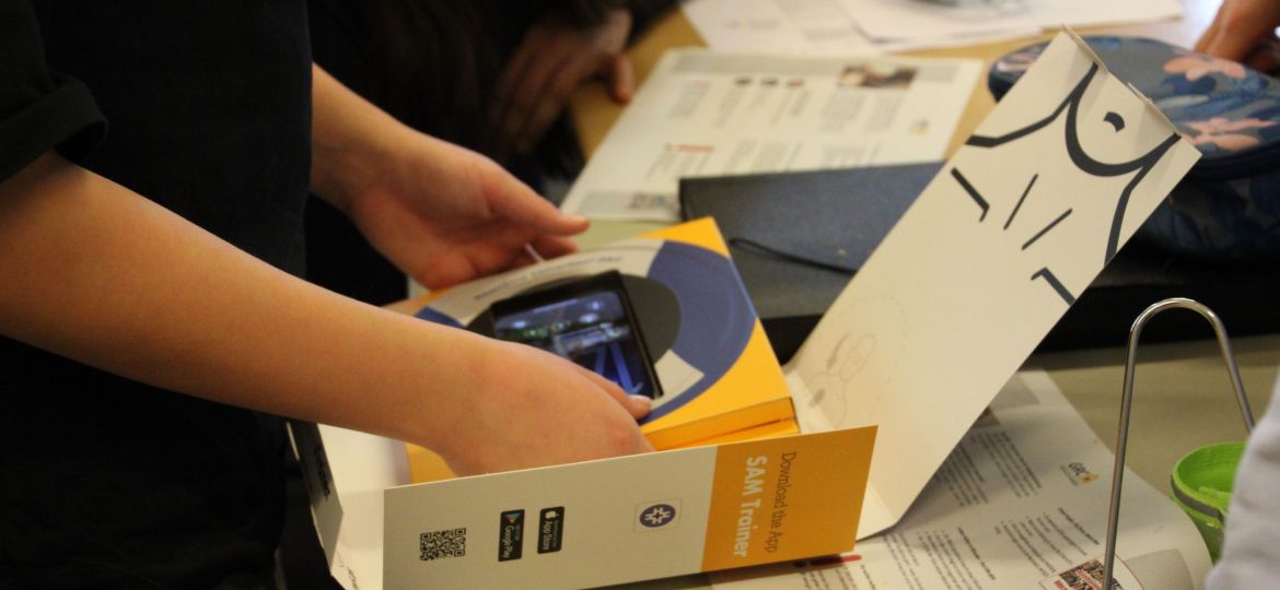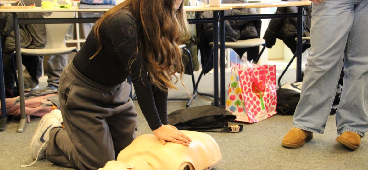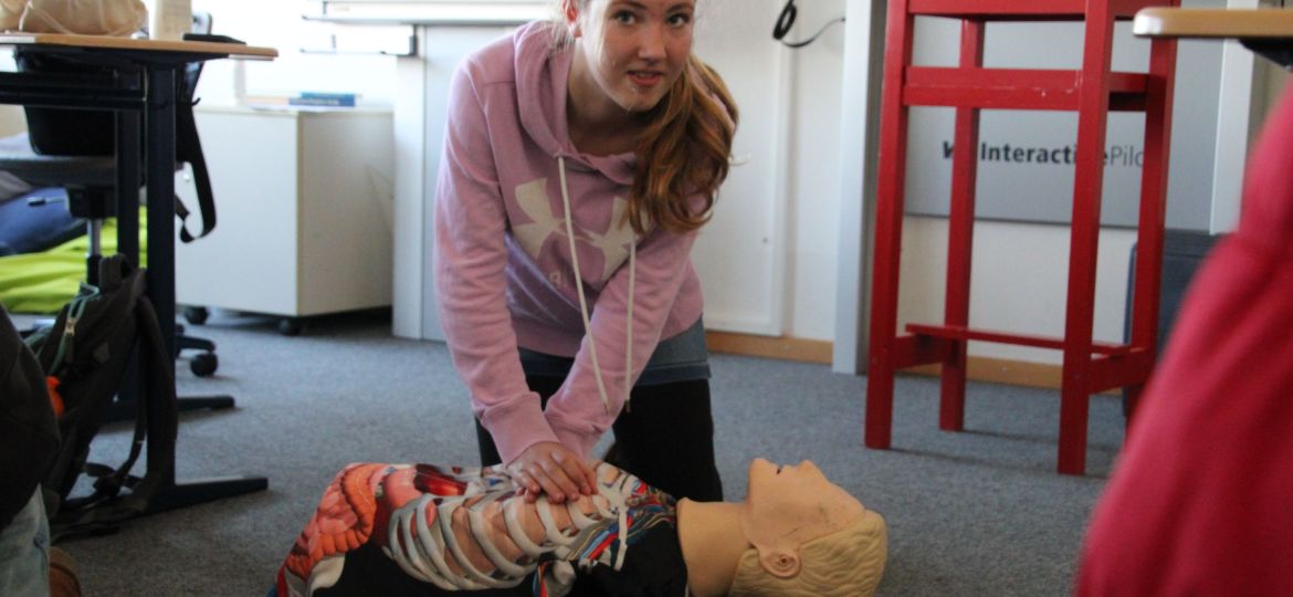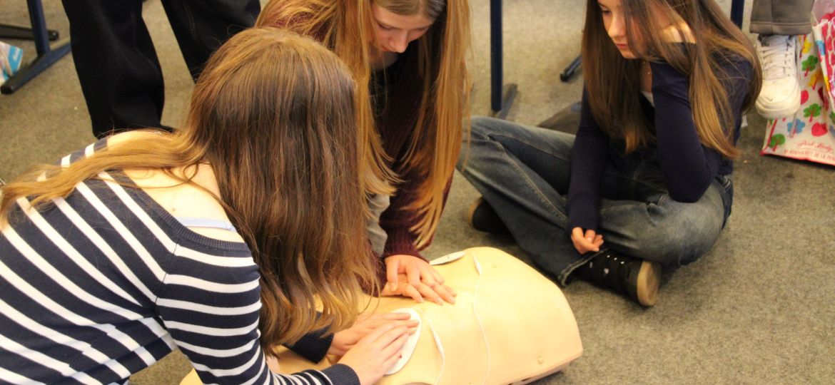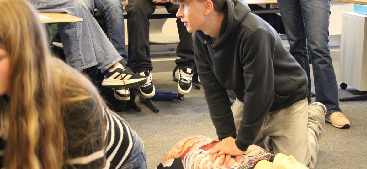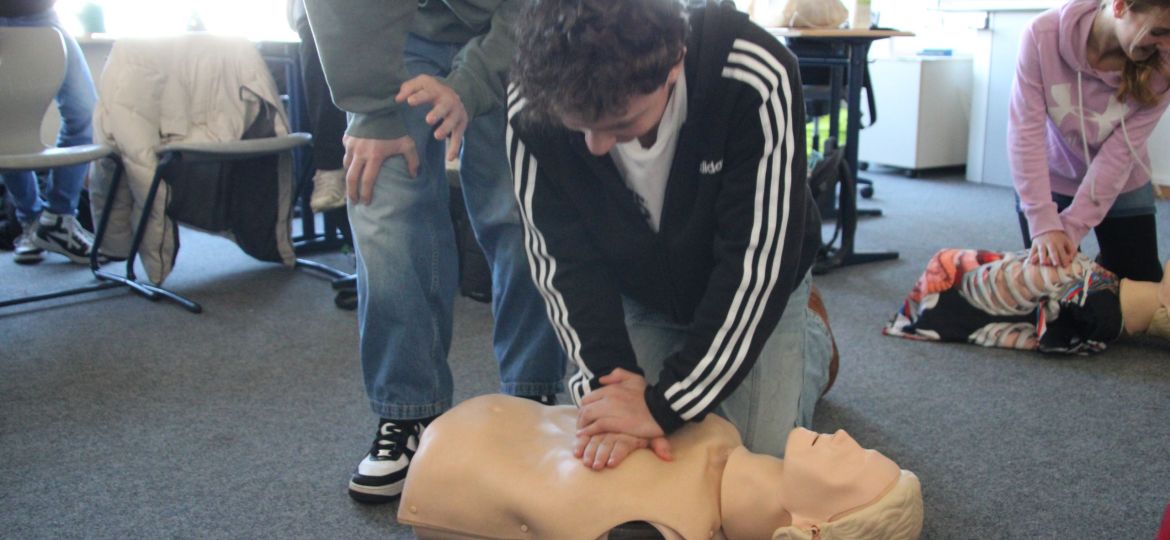 Und wo im Betrieb und in der Öffentlichkeit gutes Benehmen wichtig sind, sind Kenntnisse in der Ersten Hilfe sogar noch wichtiger. Auch darum ging es: Unter der Anleitung von Thorben lernten die Schüler*innen, wie man einen Notruf absetzt, wie man eine Herzdruckmassage durchführt und wie man Defibrilatoren nutzt.